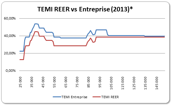 Dans le graphique ci-dessous, j’ai superposé les courbes de TEMI pour la situation où deux travailleurs autonomes sans enfant gagnent chacun 50 % des revenus du couple. La courbe en bleu illustre les TEMI pour un revenu d’entreprise alors que la courbe en rouge indique les taux applicables à une cotisation REER.